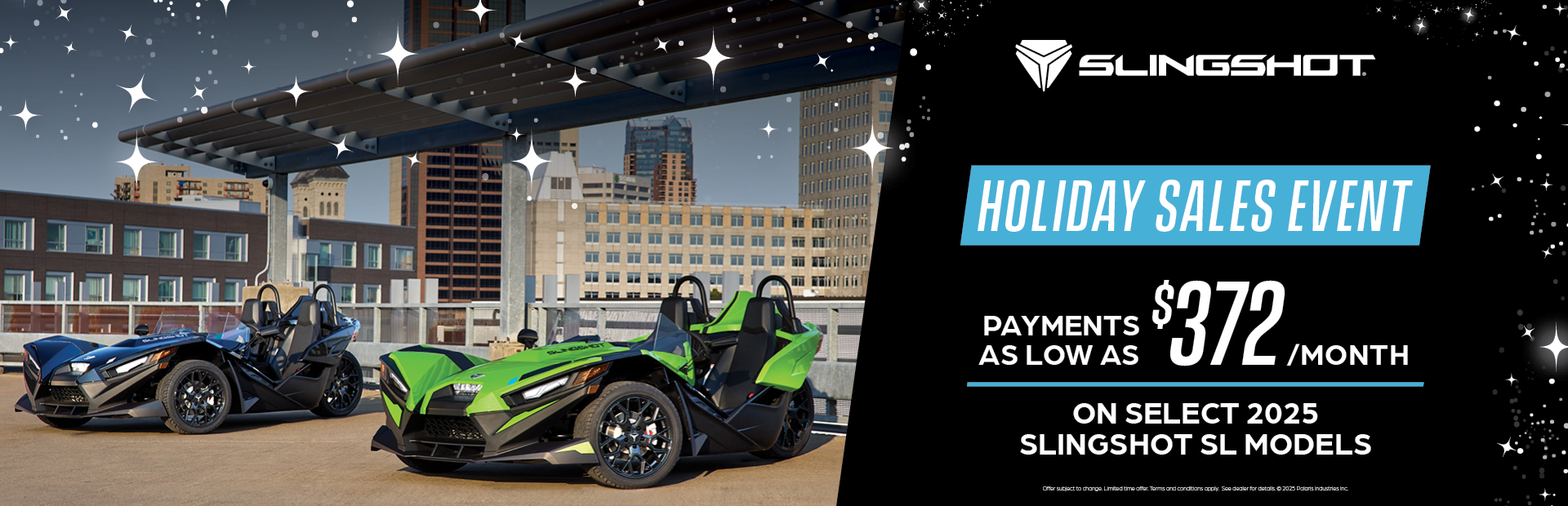 This is a limited time offer which consists of $1,000 Customer Cash rebate towards the purchase of new model year 2025 Slingshot. This offer is subject to change and may be extended or terminated without further notice. Offer may not be combined with promotional financing on Slingshot SL, SLR, and R models. All rebates paid to dealer and are not redeemable for cash. The $1,000 customer cash offer is specific to 2025 Slingshot SL, SLR, and R models. Offer Valid: December 1 – 31, 2025.
