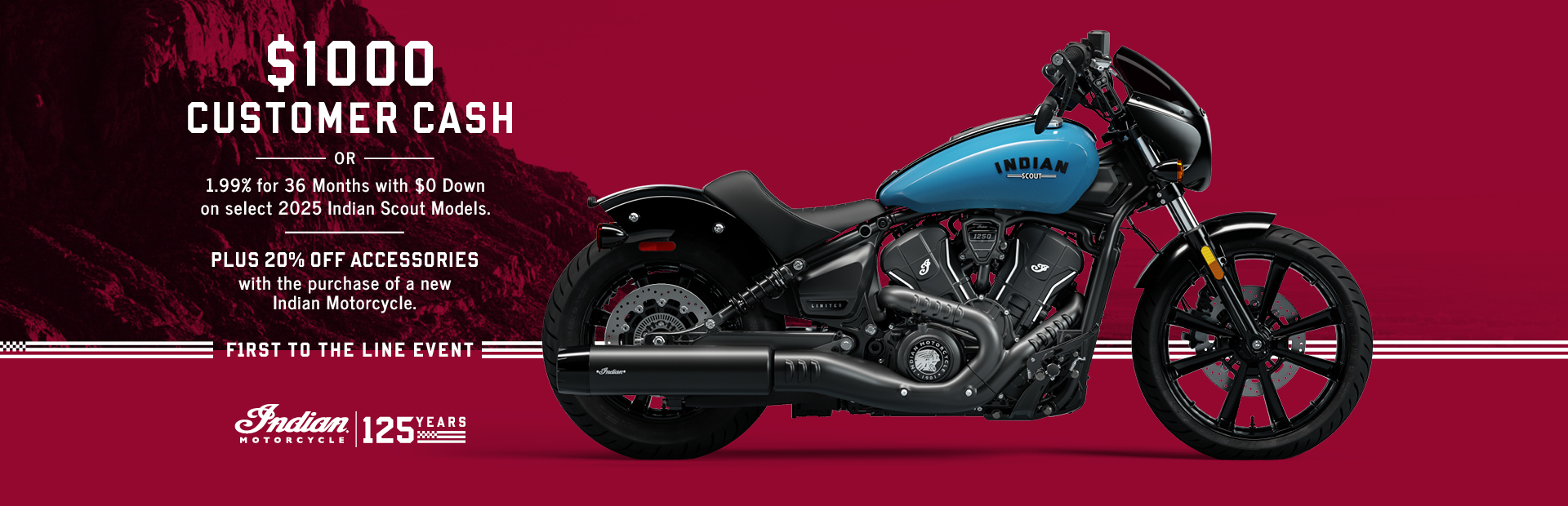 This is a limited time offer which consists of $1,000 Customer Cash rebate towards the purchase of new model year 2025 Indian Challenger, Indian Pursuit, Chieftain, Chieftain PowerPlus Dark Horse, Roadmaster, or Indian Springfield models (excludes Elite models). This offer is subject to change and may be extended or terminated without further notice. Offer may not be combined with promotional financing offers. All rebates paid to dealer and are not redeemable for cash. Offer Valid: December 1 – 31, 2025.